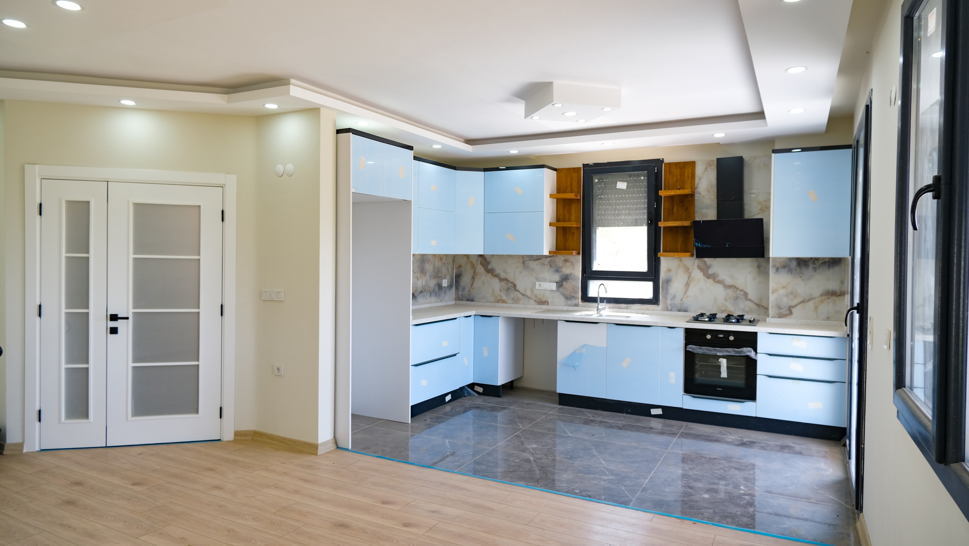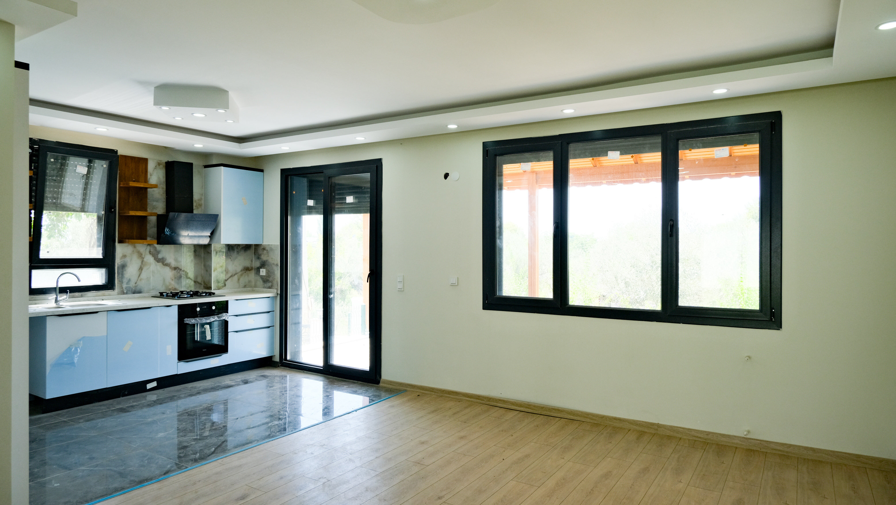 Narlı Sahili’nde satılık sıfır açık mutfaklı dubleks ikiz villa.